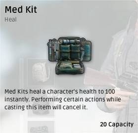 Med Kit merupakan salah satu peralatan medis yang paling ampuh sekaligus cukup jarang ditemukan dalam game ini. Tidak peduli seberapa parah keadaan pemain, ketika sudah menggunakan Med Kit, HP yang dimiliki bisa langsung terisi penuh hingga 100%. Untuk memakainya secara sempurna dibutuhkan waktu hingga 8 detik. Pastikan kamu memakai item ini di tempat tersembunyi jauh dari serangan musuh. Pasalnya, pemakaian Med Kit memakan waktu yang cukup lama. Selain itu, sebaiknya gunakan Med Kit dalam keadaan yang benar-benar terdesak saat jumlah orang sudah sangat sedikit